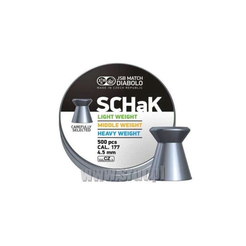 Śrut JSB Schak to wysokiej klasy lekki śrut wiatrówkowy w kalibrze 4,5 mm. Materiał oraz sposób wykonania sprawia, że należy on do jednych z najlepszych śrutów na świecie. Polecany szczególnie do strzelania z pistoletów na krótkich dystansach.