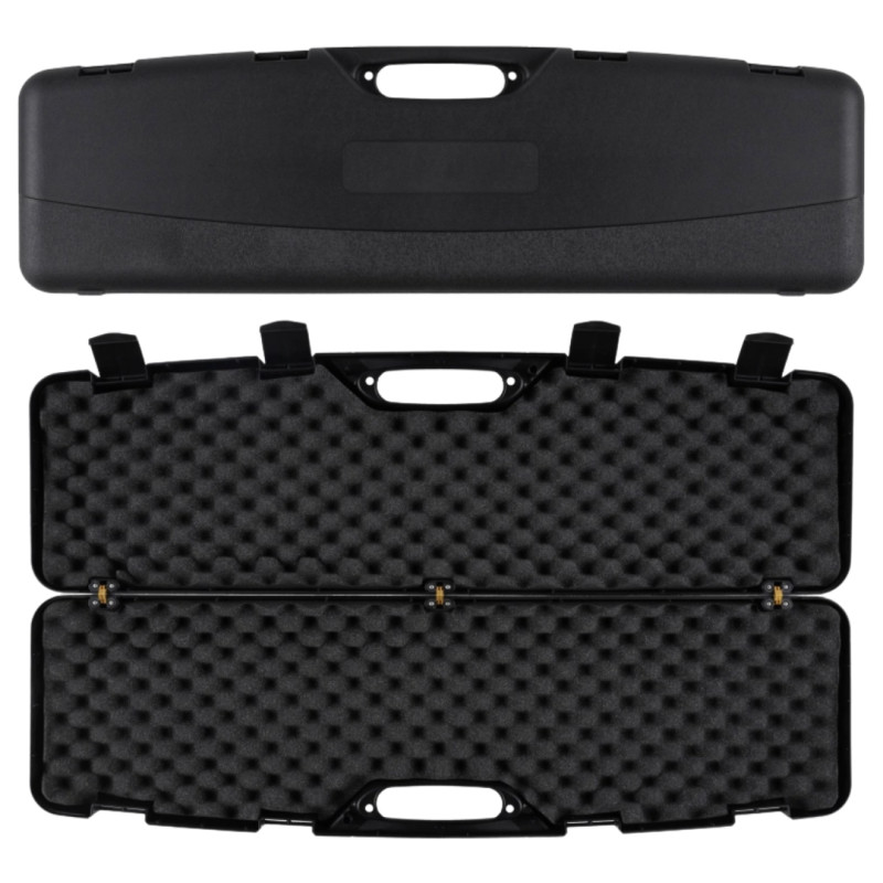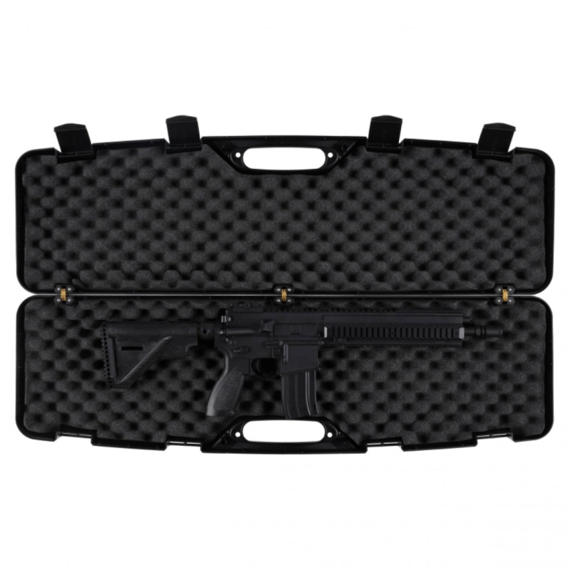 Kufer do transportu broni, wykonany z wytrzymałego tworzywa, wyłożony grubą gąbką o strukturze tzw.
