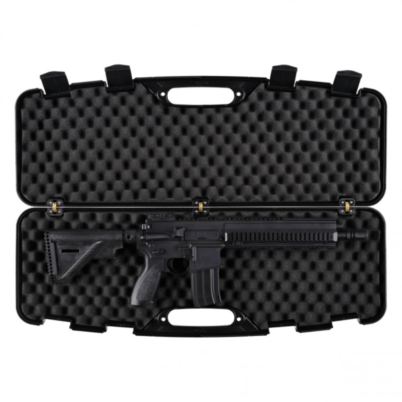 Wytrzymałe zawiasy i ścianki o grubości 3 mm zapewniają bezpieczny transport broni oraz trwałość walizki.
